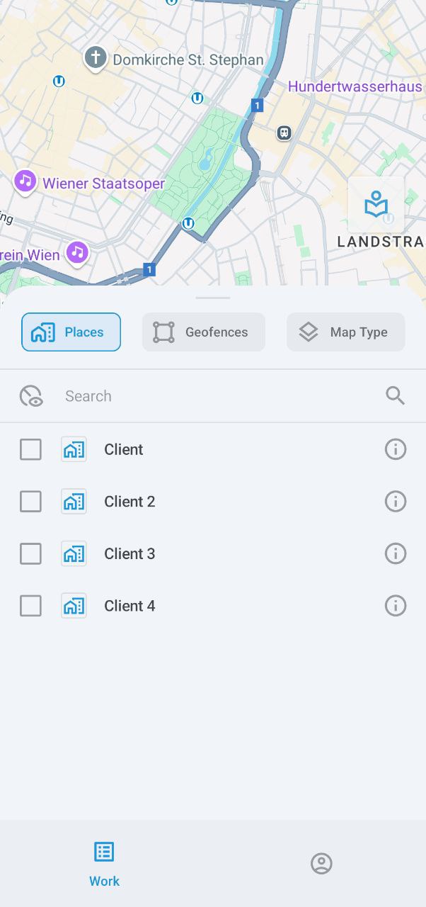 Toque para mostrar el menú de opciones del mapa, donde puede seleccionar lugares, geocercas y tipo de mapa. Tenga en cuenta que la selección del tipo de mapa actualmente solo está disponible en dispositivos Android.